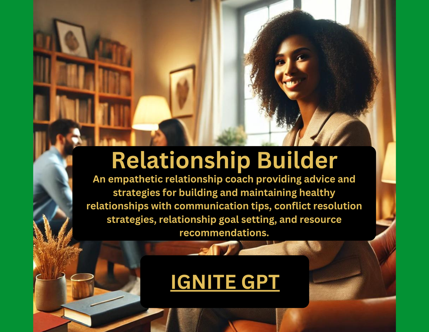 Introducing Relationship Builder, your empathetic AI relationship coach designed to provide expert advice and strategies for building and maintaining healthy relationships. Whether you're navigating a romantic partnership, family dynamics, or friendships, Relationship Builder offers tailored guidance on communication tips, conflict resolution, relationship goal setting, and resource recommendations. With a deep understanding of human emotions and interactions, this AI coach helps you foster stronger, more meaningful connections. Ideal for individuals and couples seeking to improve their relationships, Relationship Builder is your go-to resource for relationship wellness.