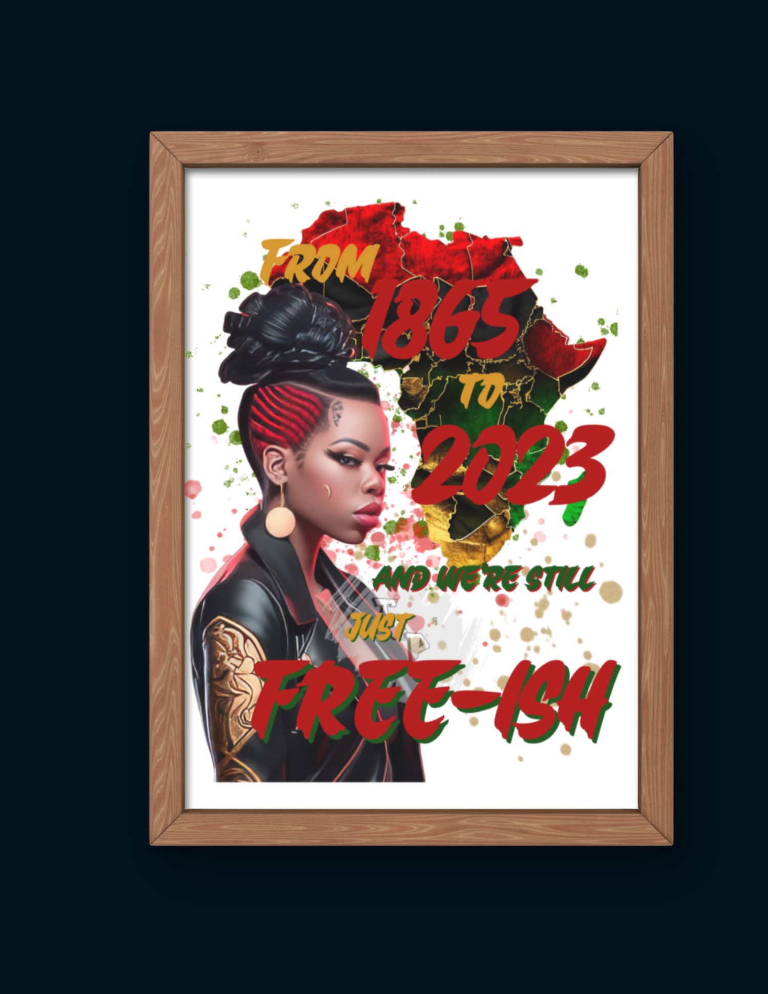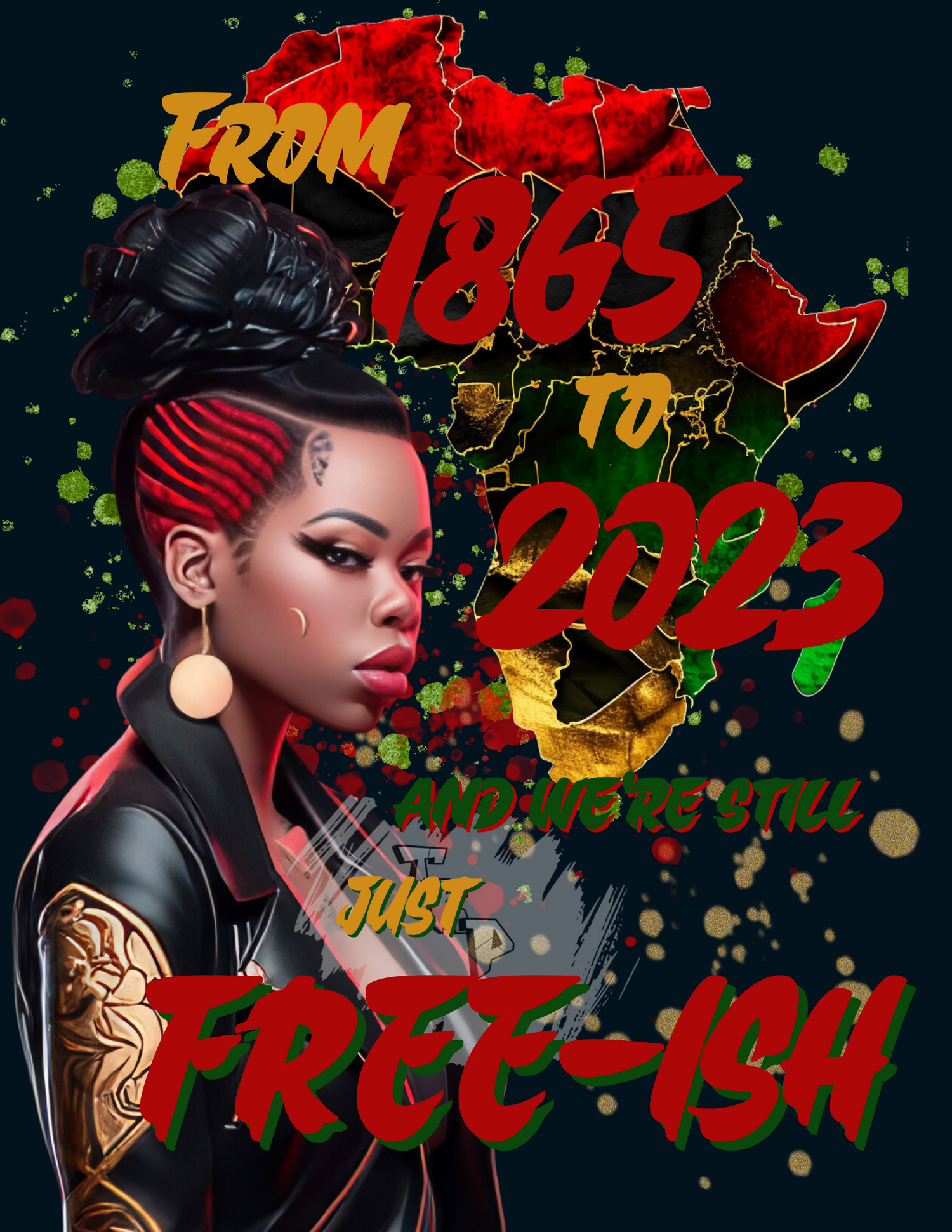 This design was created to give a significant message - after all this time, have we achieved TOTAL freedom or are we still just FREE-ISH. This design is sure to be a head turner and a conversation starter.
